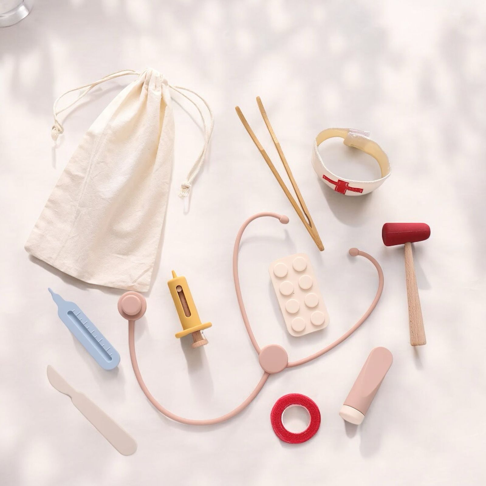 - Imaginary Game Set: This set includes various wooden items designed to evoke creative scenarios and role-playing games related to medical care. It also encourages problem-solving and fine motor skills