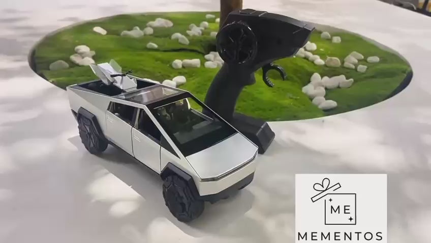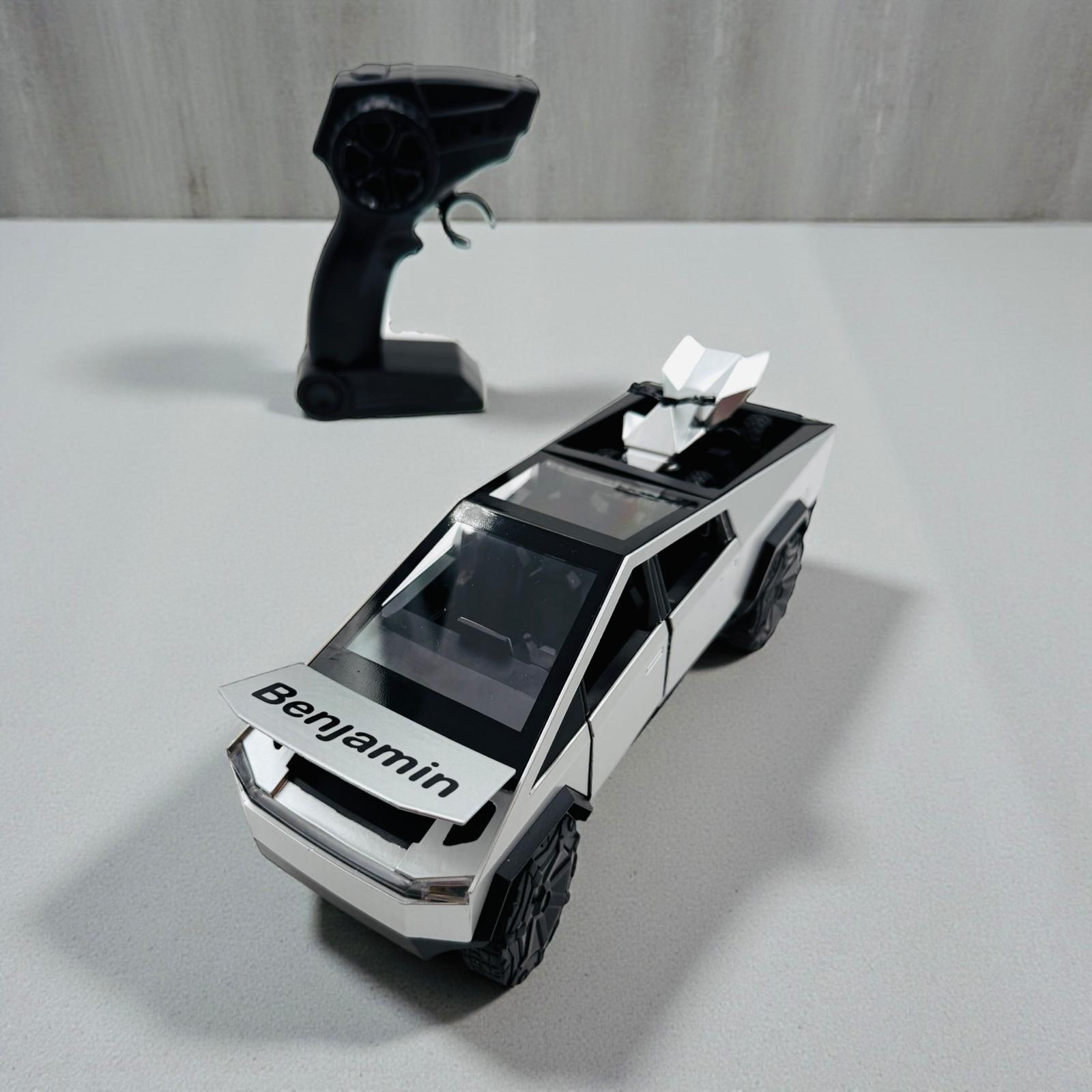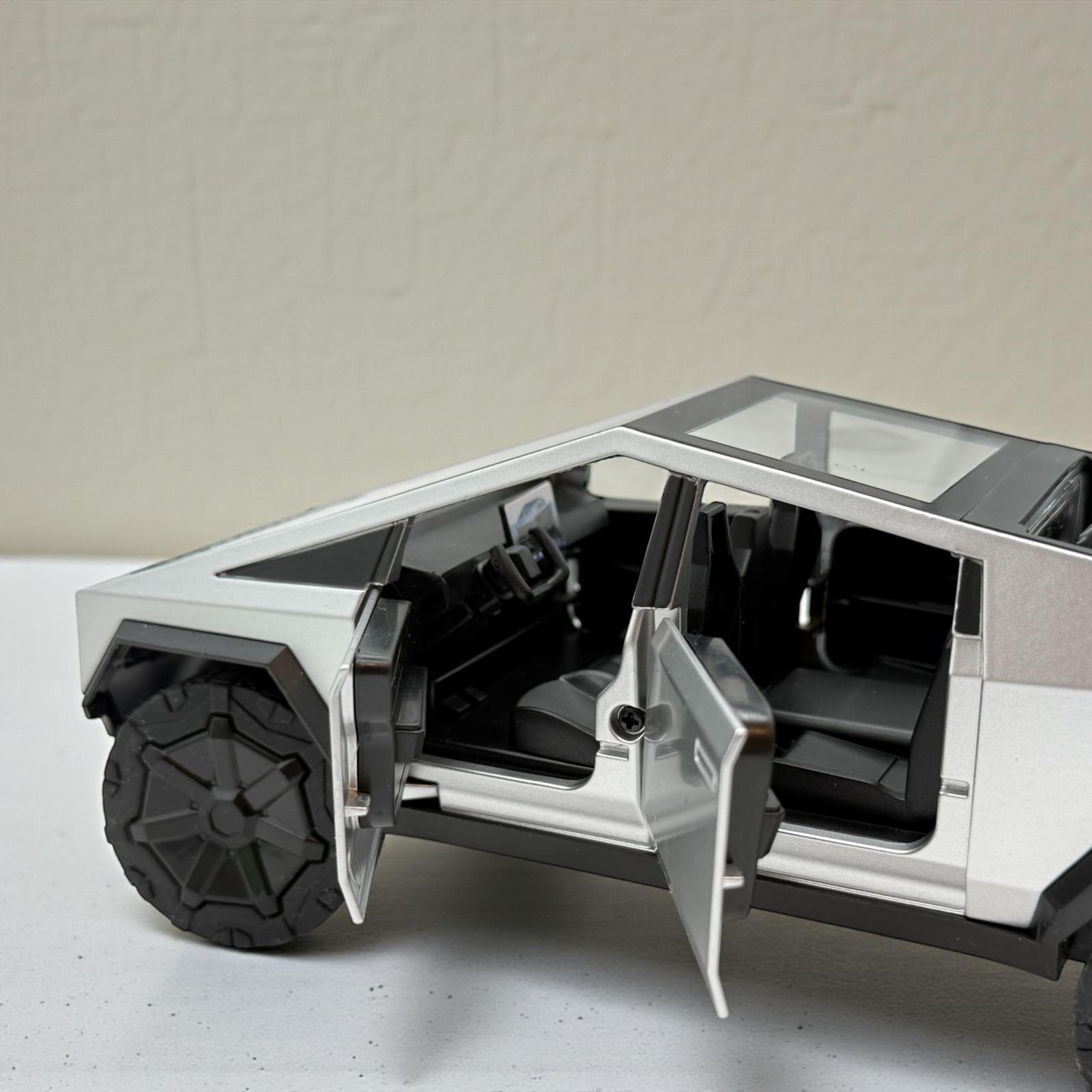 A high-quality RC Cybertruck–inspired model car with opening doors, remote, lights and sound.
