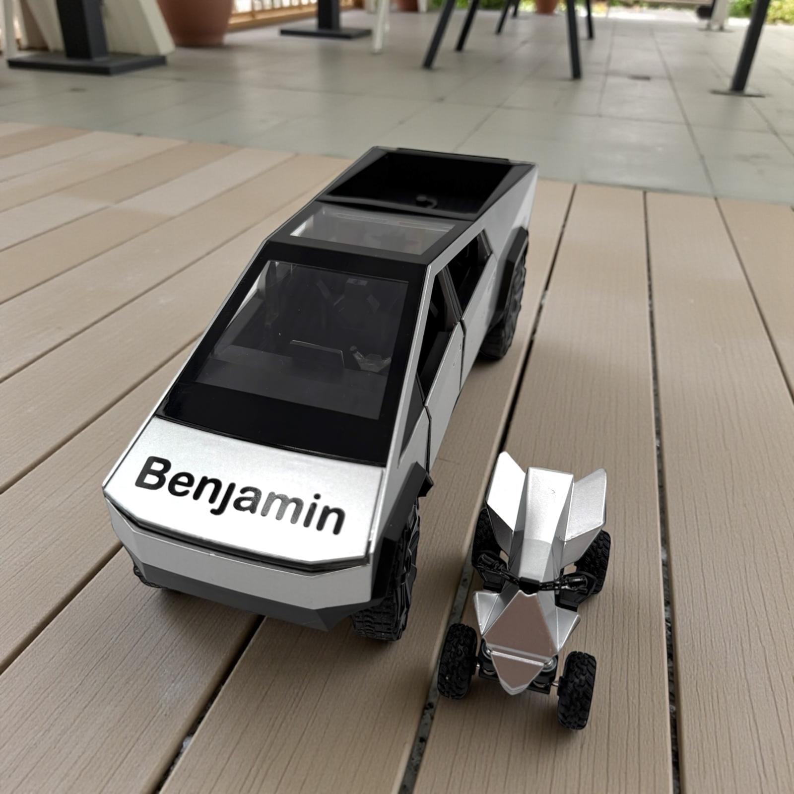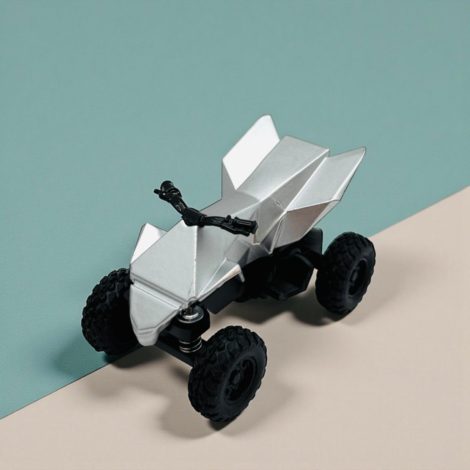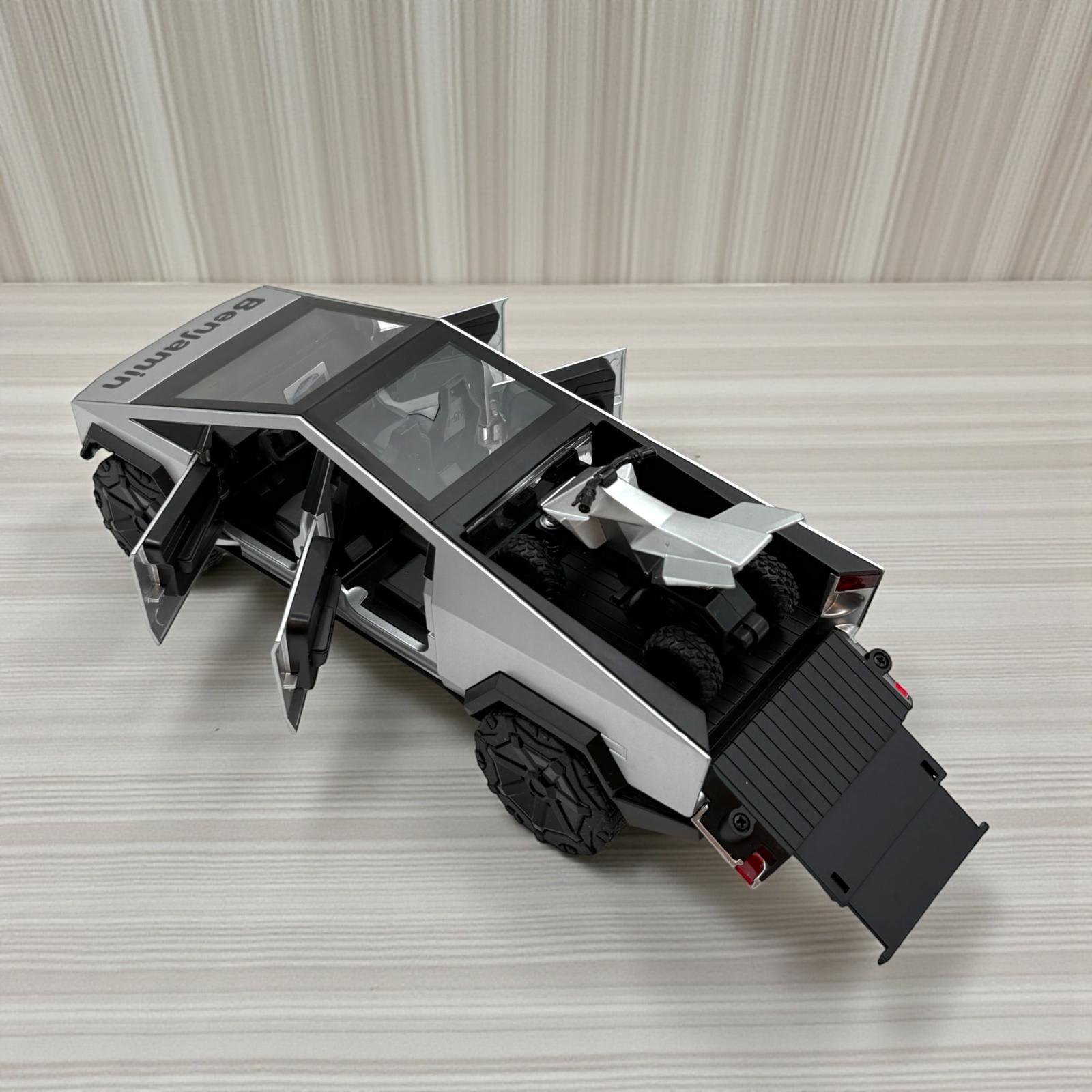 A high-quality RC Cybertruck–inspired model car with opening doors, remote, lights and sound.