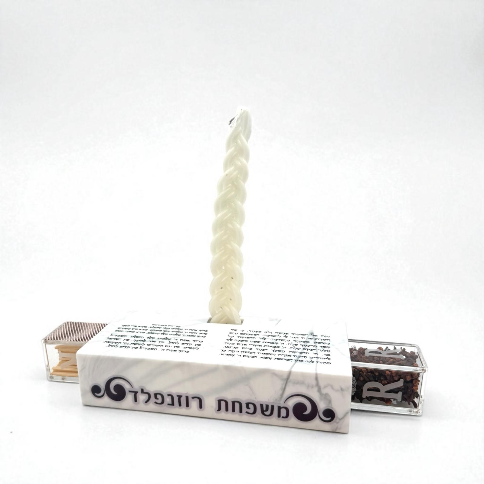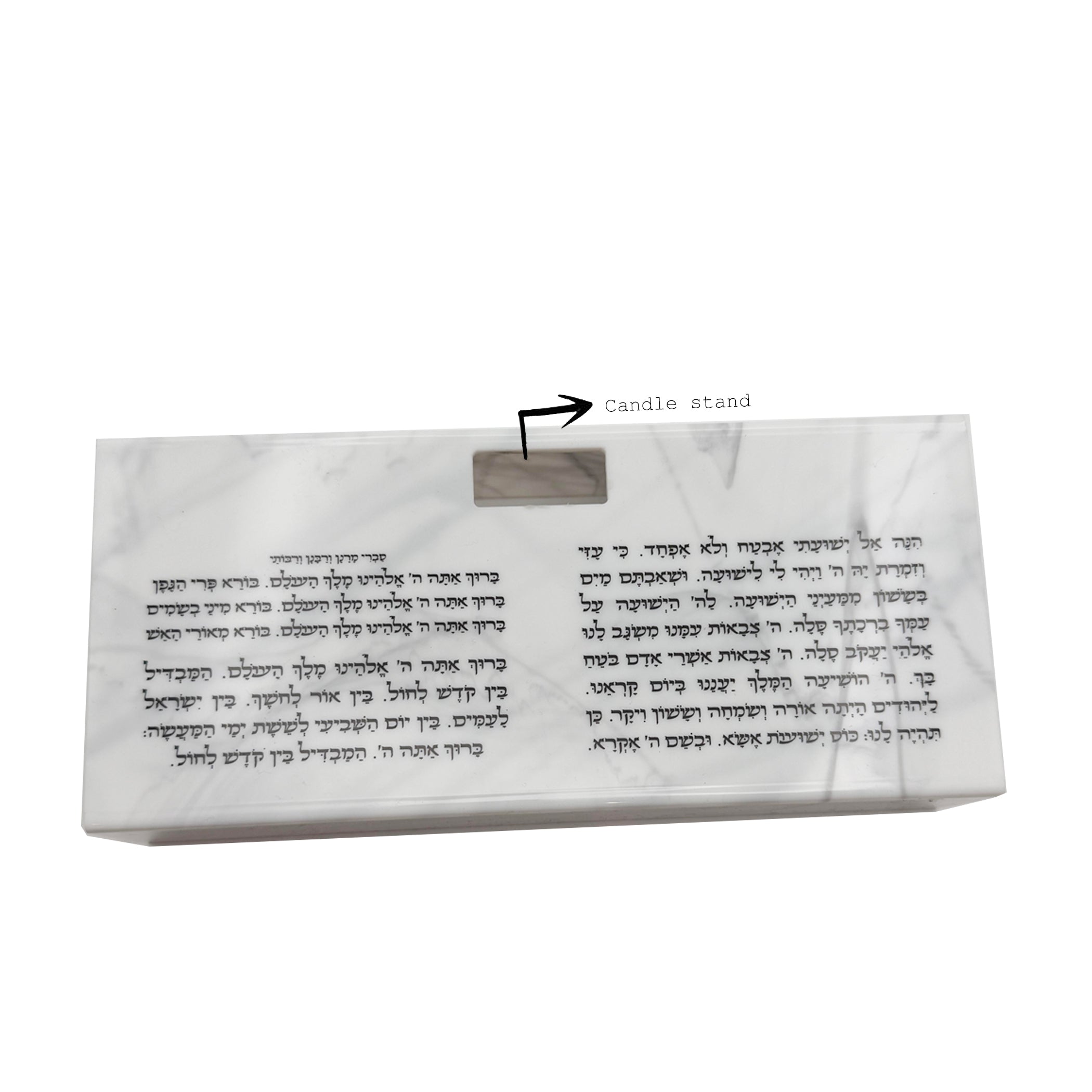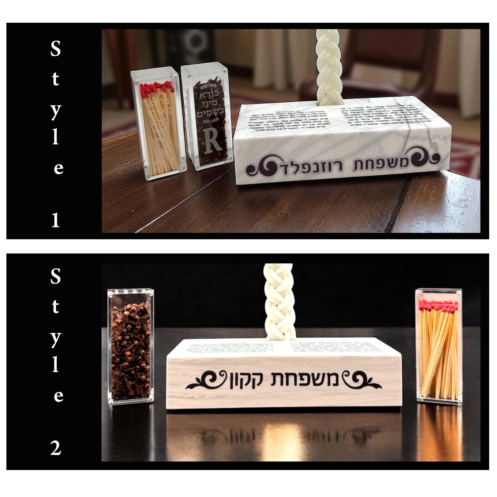* A high-quality marble-style plastic box with a classic style Havdalah prayer with Personalization of the last name with UV printing