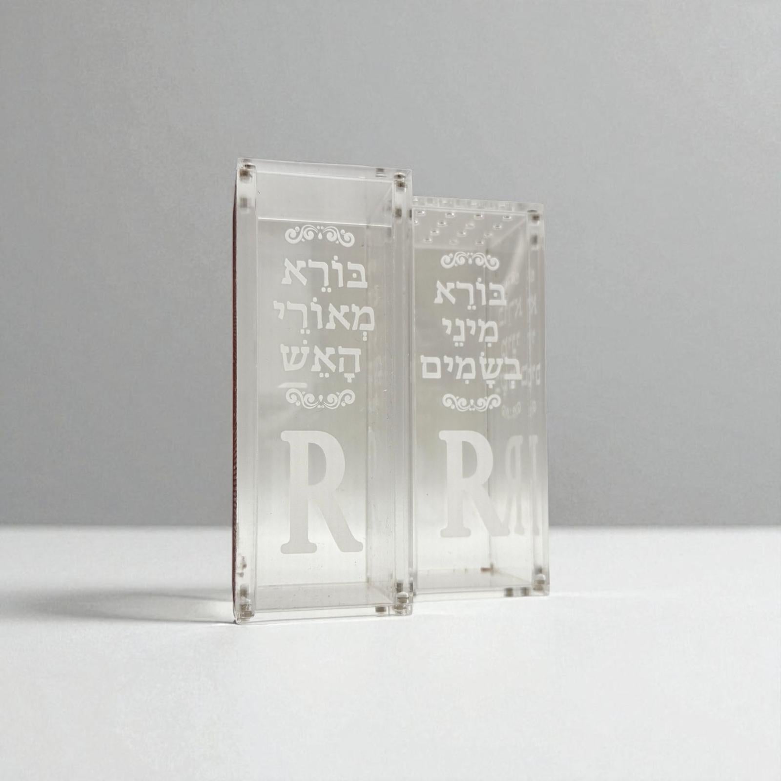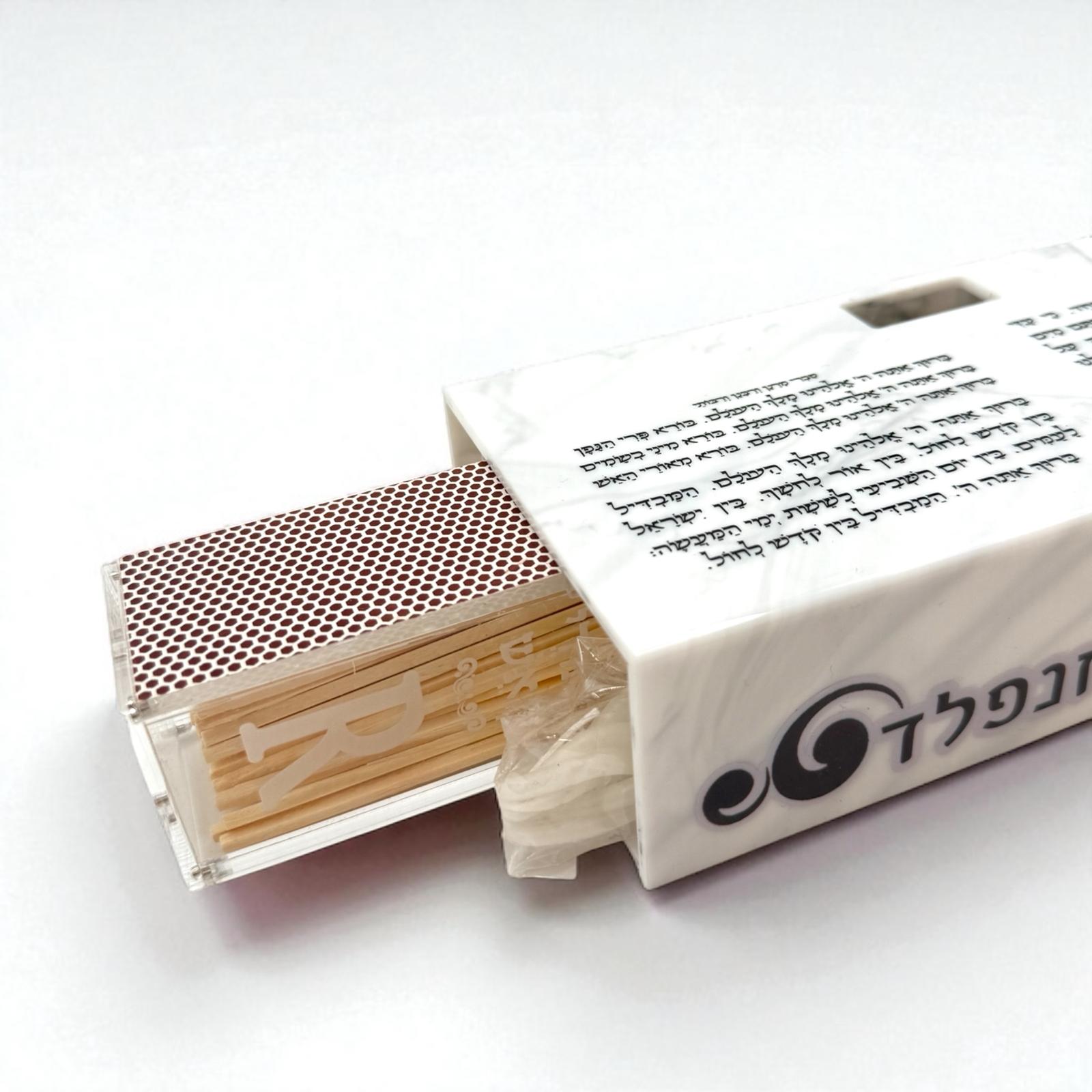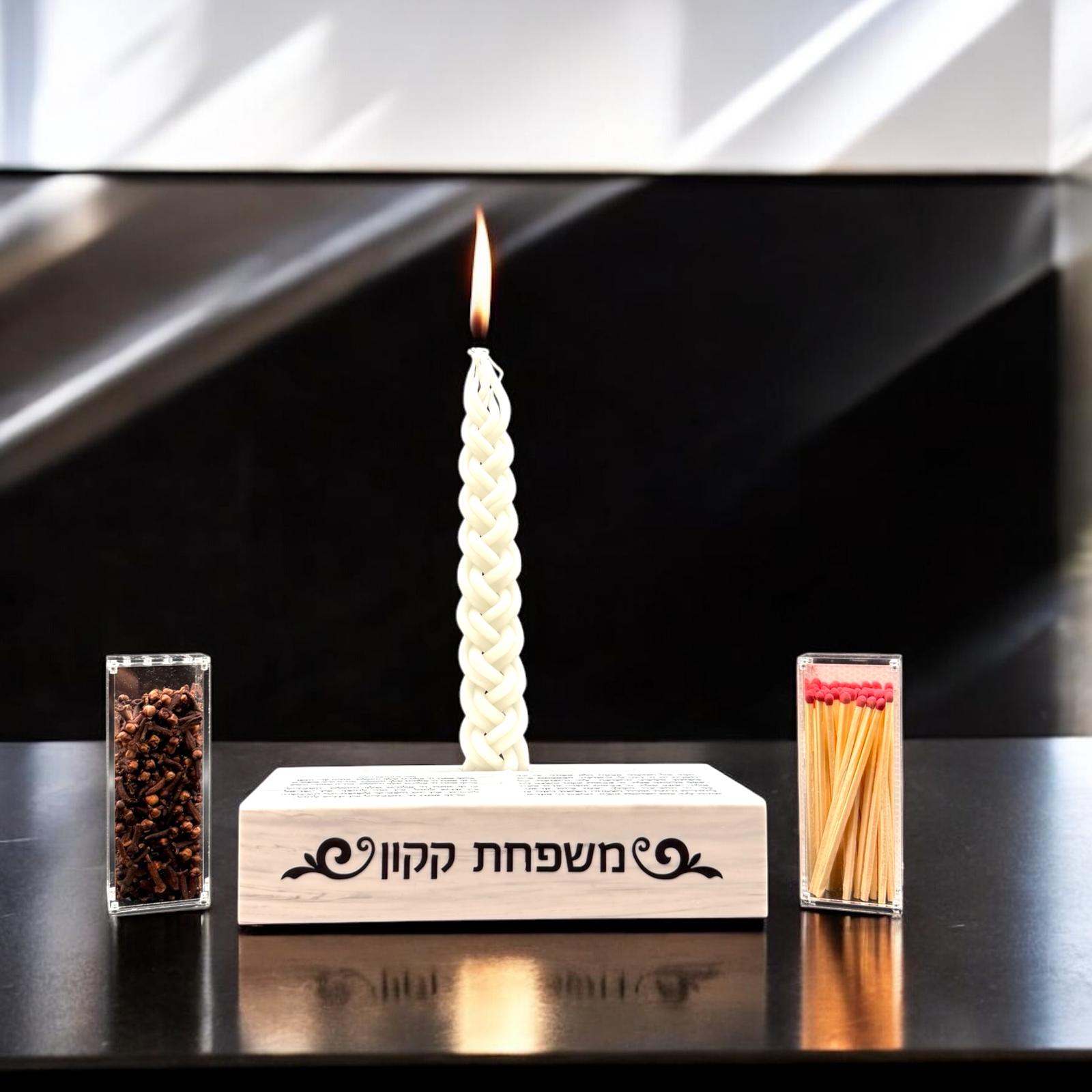 * A high-quality marble-style plastic box with a classic style Havdalah prayer with Personalization of the last name with UV printing