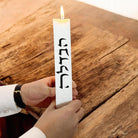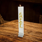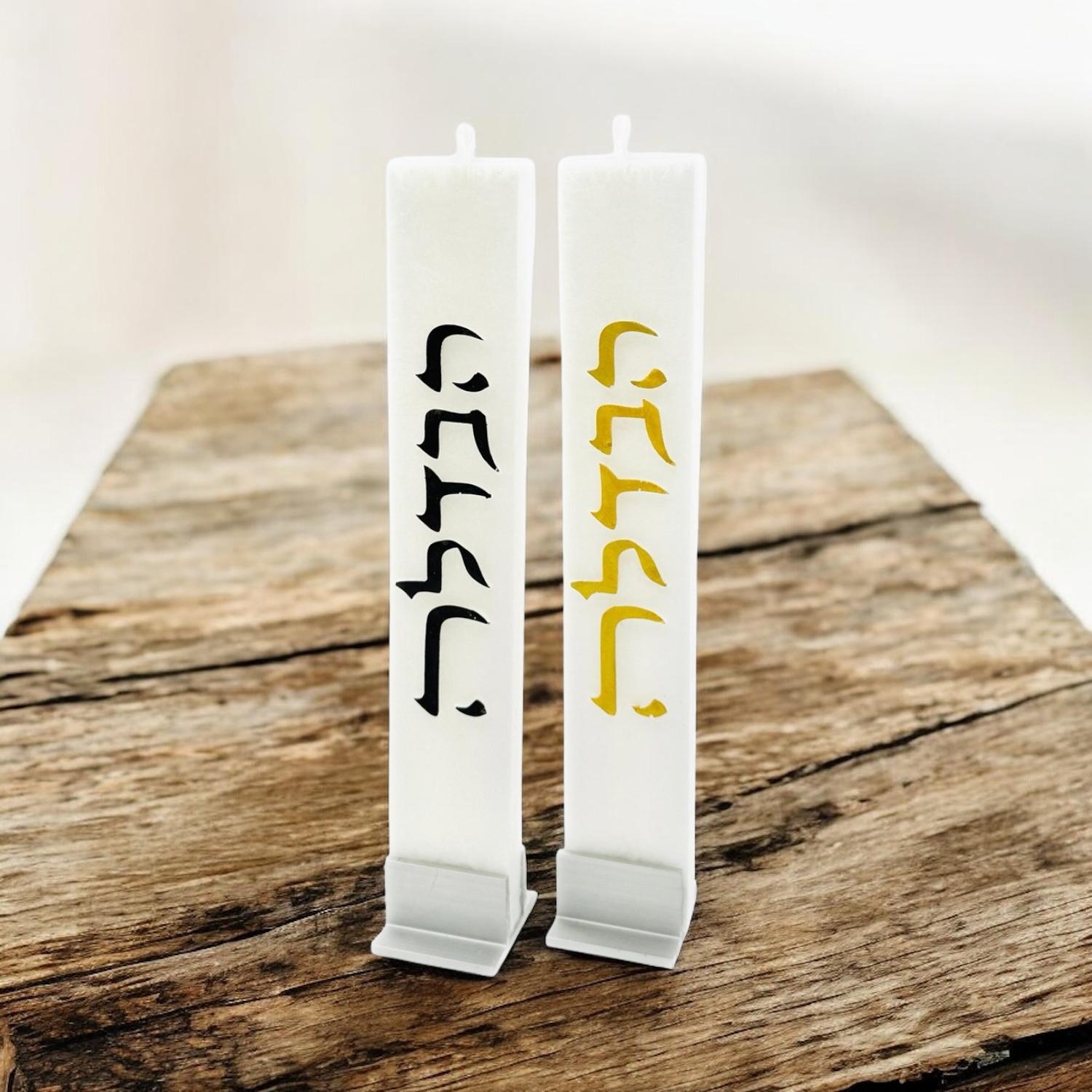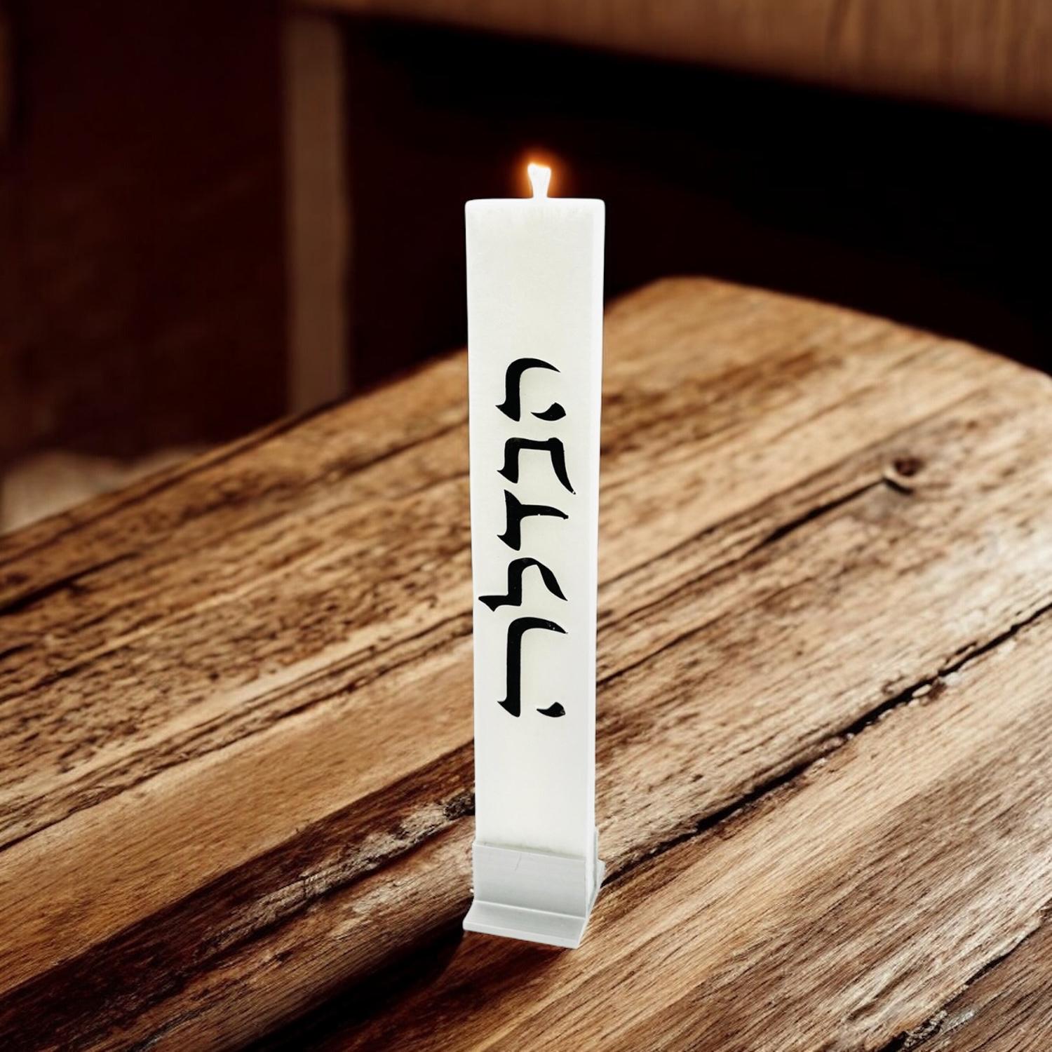 Havdalah flat candle features words הבדלה down the center.