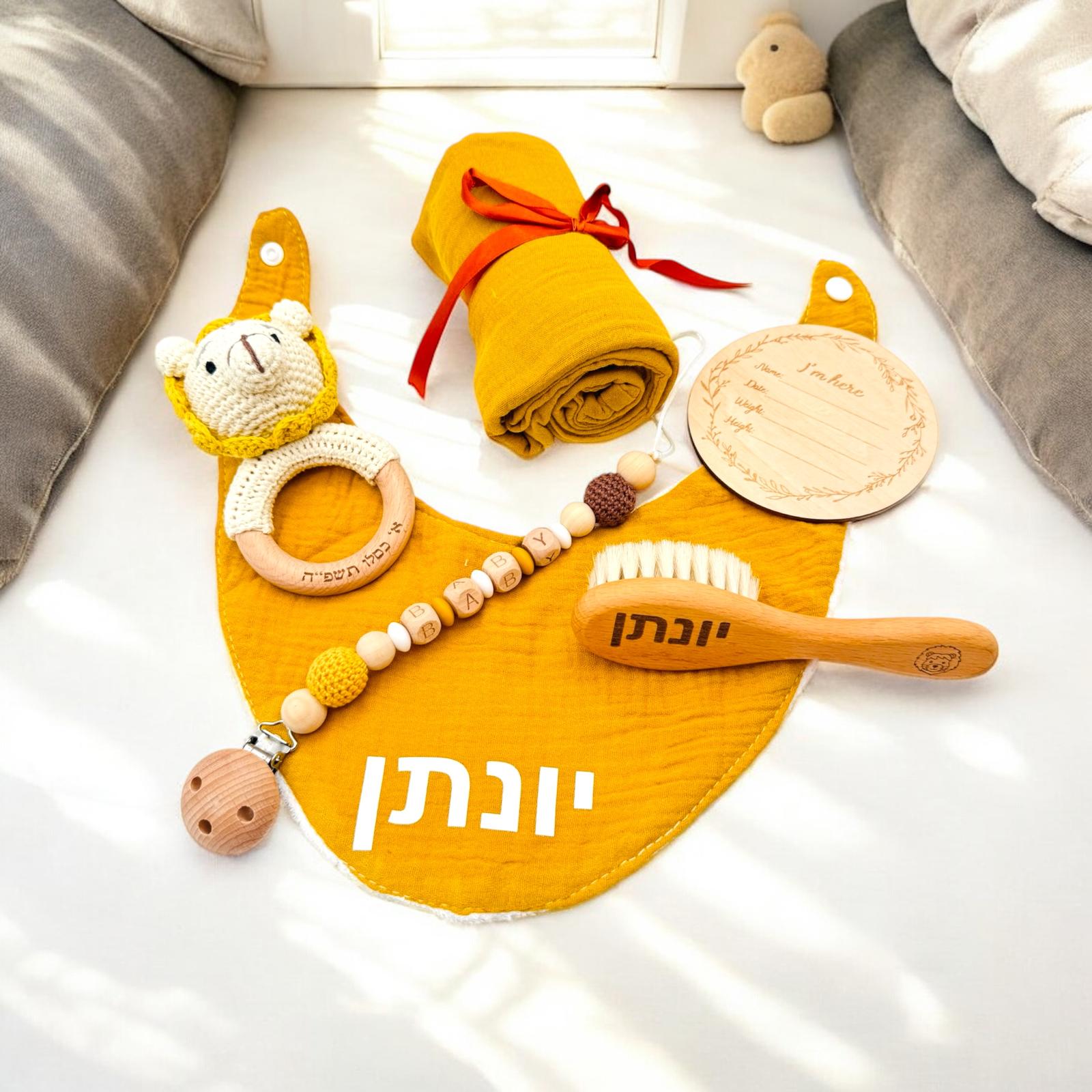 A unique gift with the baby's name on the brush and apron and the date of his birth on the toy - making your gift unique, personal and especially exciting (see attached photos)