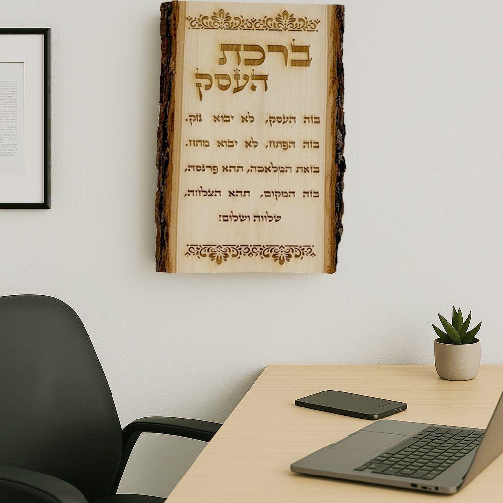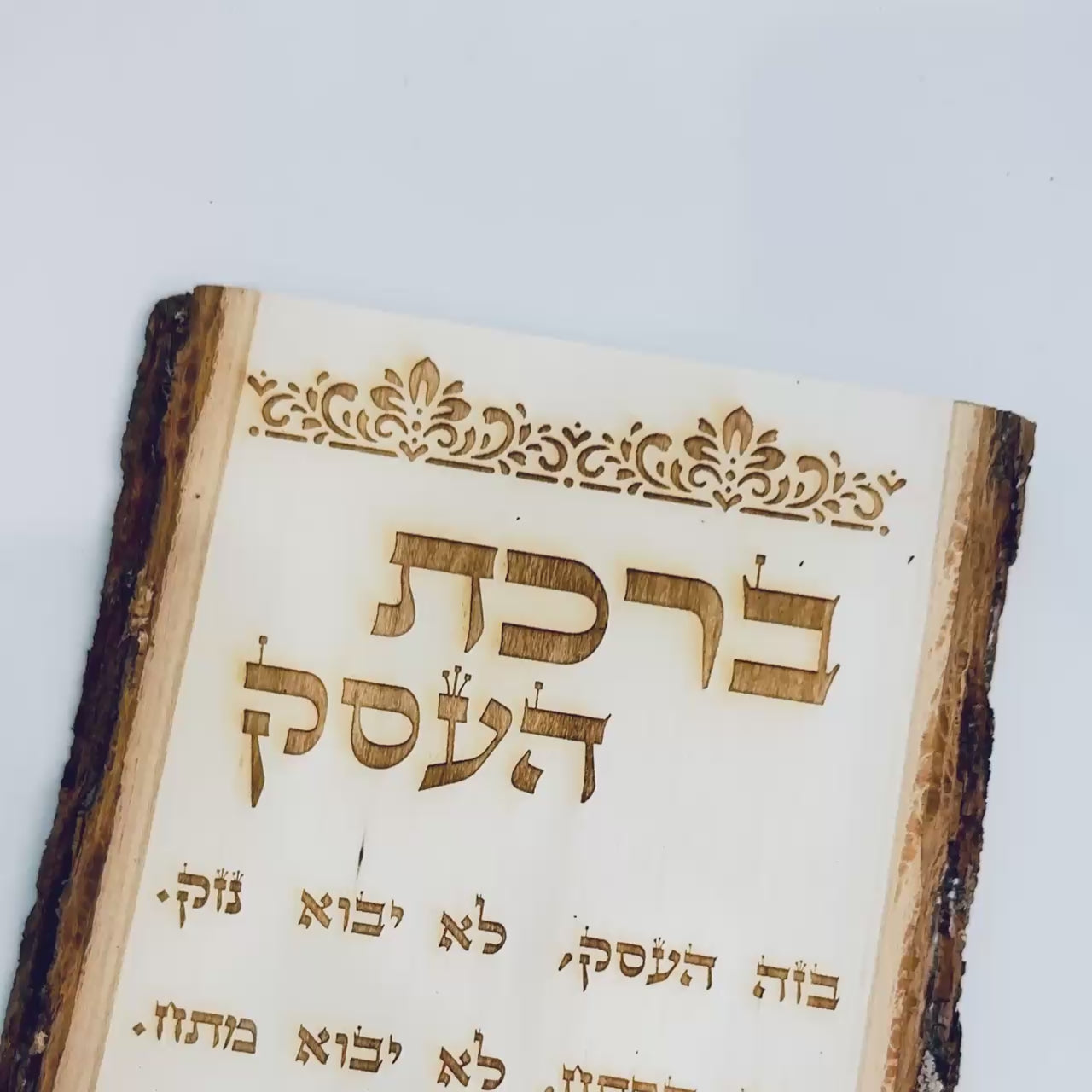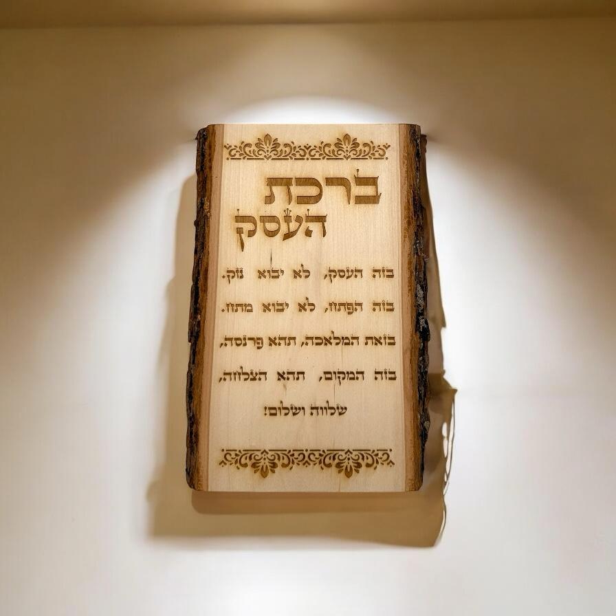 Engraving of ברכת העסק on a real wooden block - with a natural, classic and unique look.