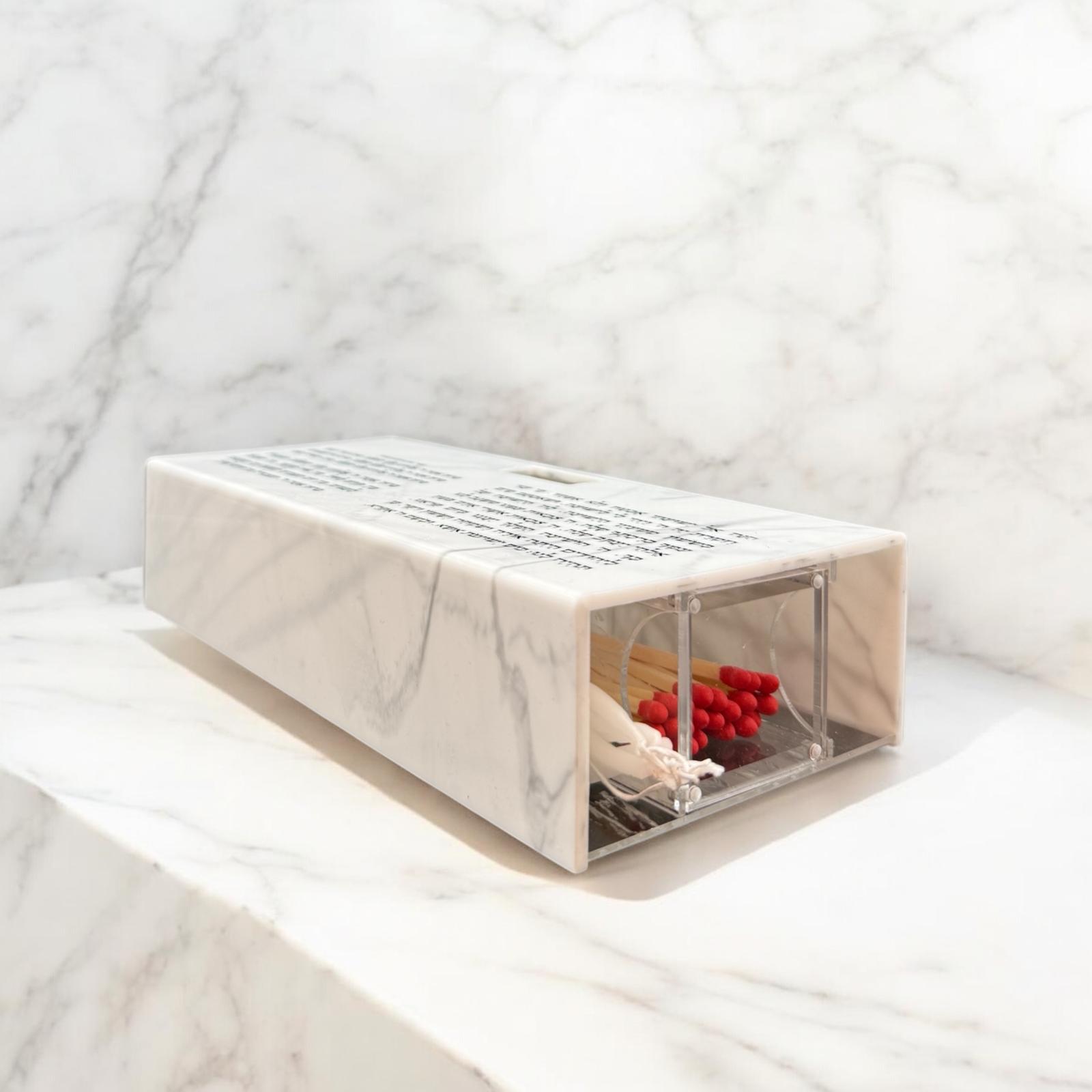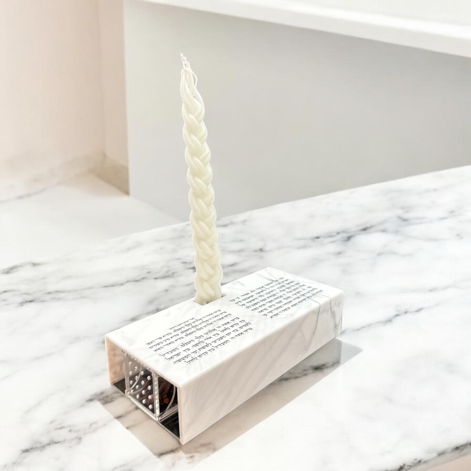 * A high-quality marble-style plastic box with a classic style Havdalah prayer with Personalization of the last name with UV printing